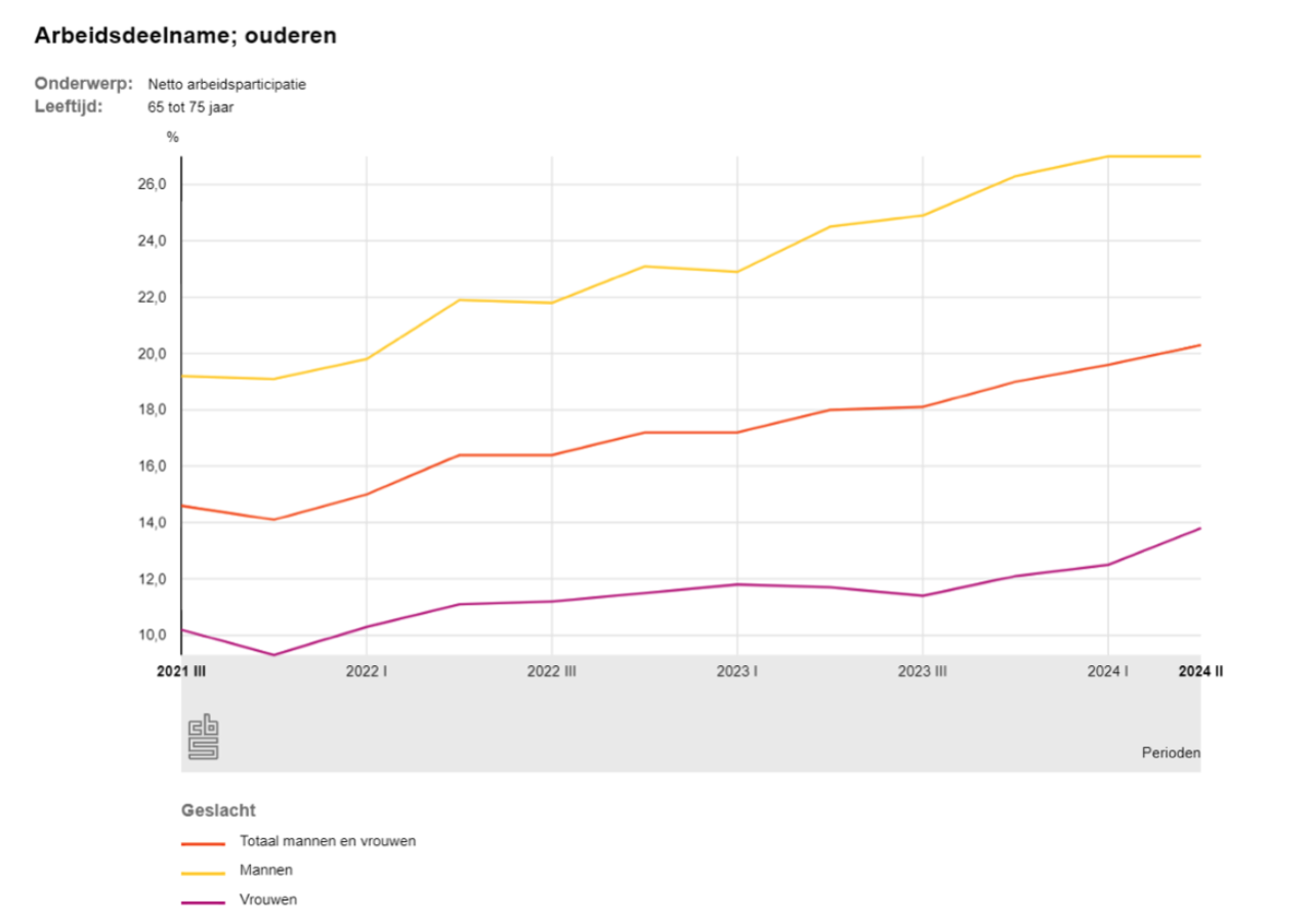 De Nederlandse arbeidsmarkt ziet steeds meer 65-plussers actief deelnemen aan het arbeidsproces. Recente CBS-cijfers (in 2024 ; zie figuur 1) tonen zelfs een aanzienlijke toename van het aantal werkende mannelijke 65-plussers van 16.4% 2022 (2e kwartaal) naar gemiddeld 20.3% in 2024.